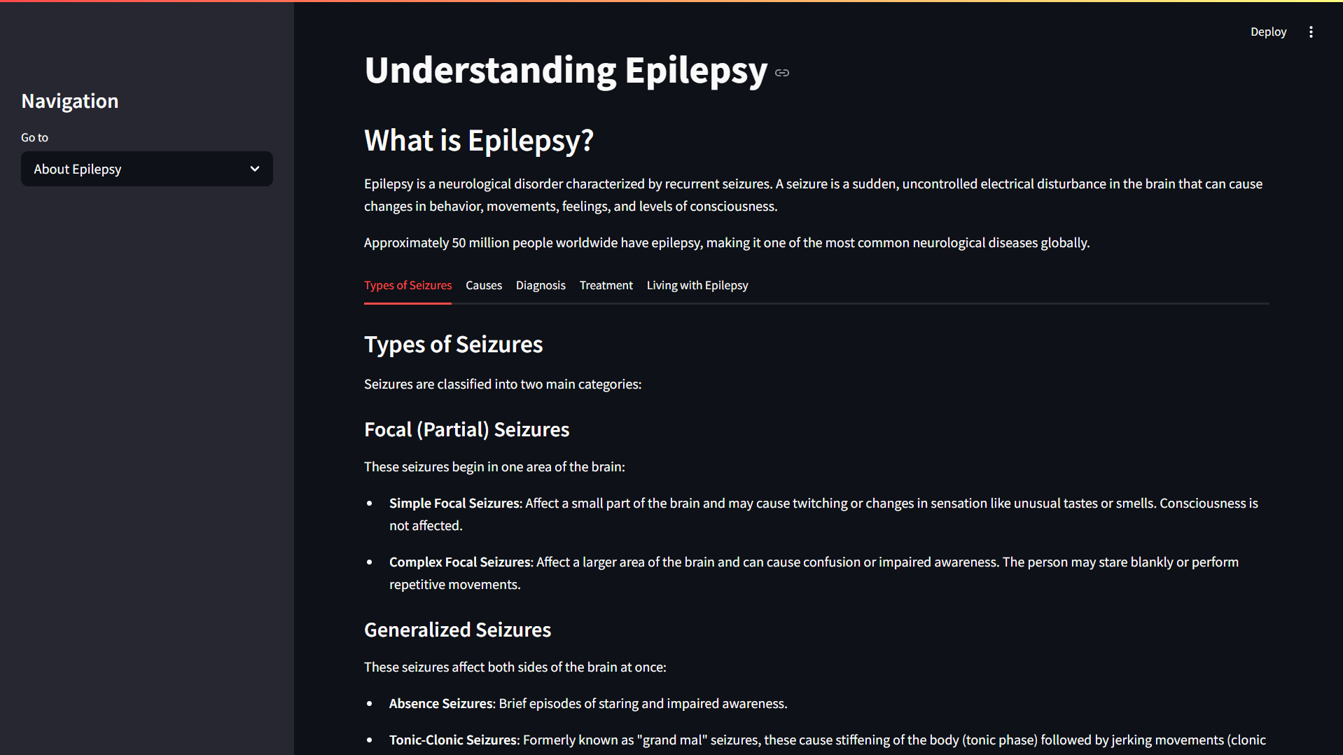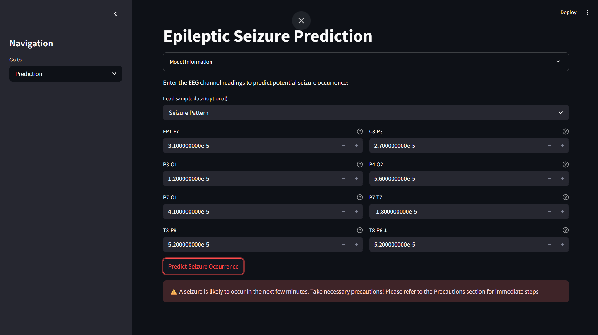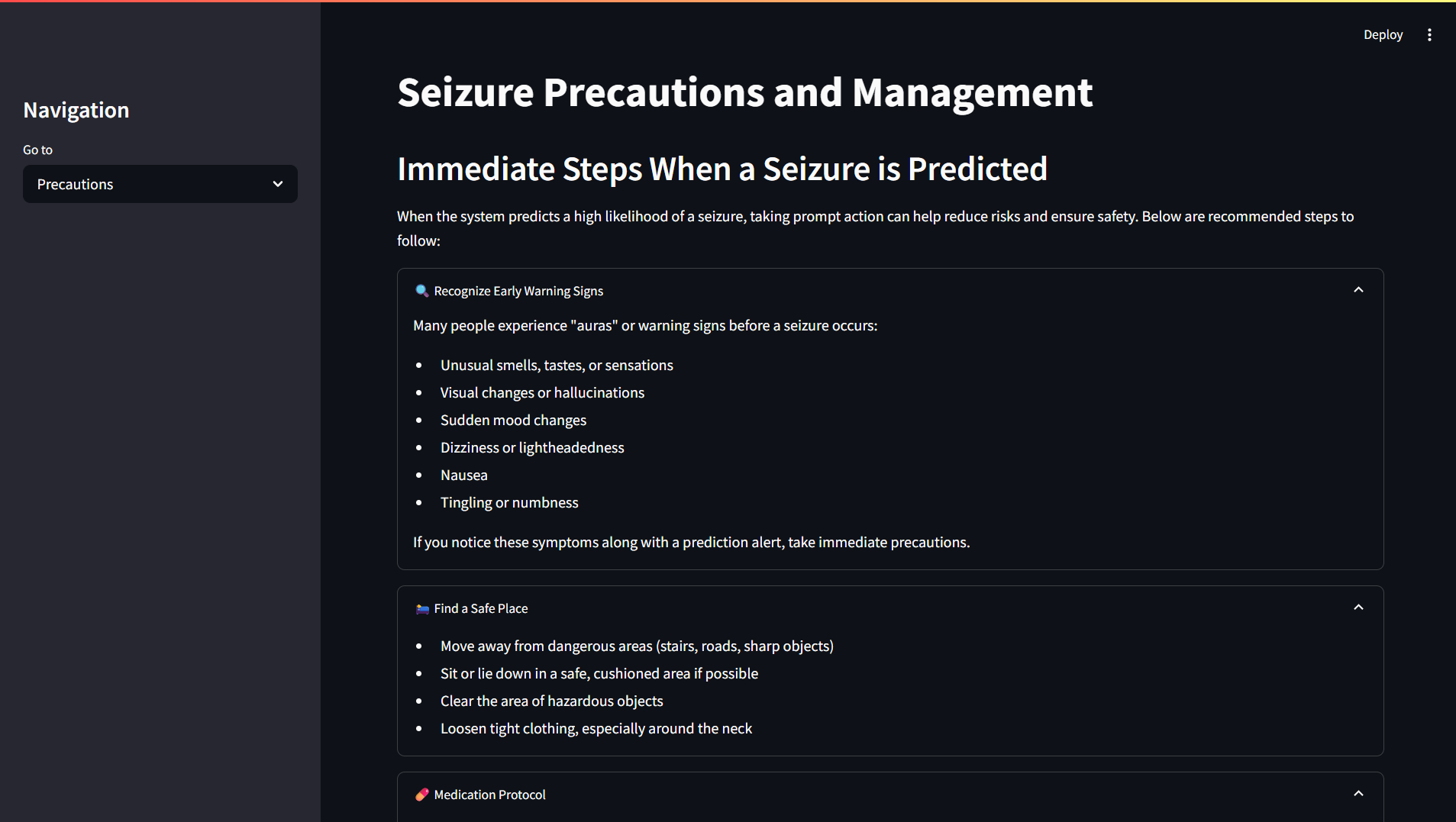 For practical application, the system is deployed as a Streamlit-based web app, allowing users to interact with the models and visualize EEG data in real-time.