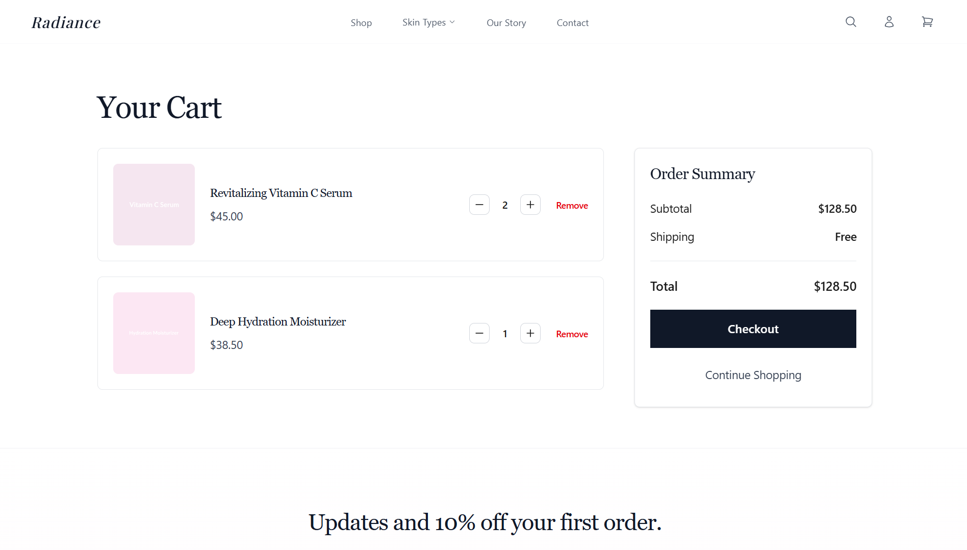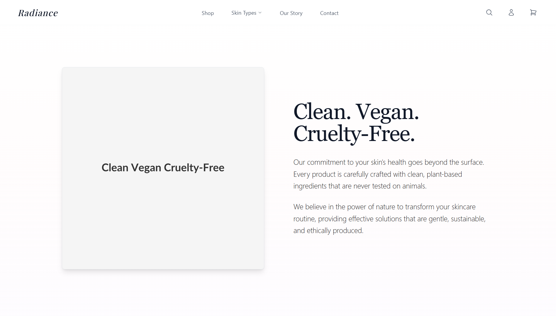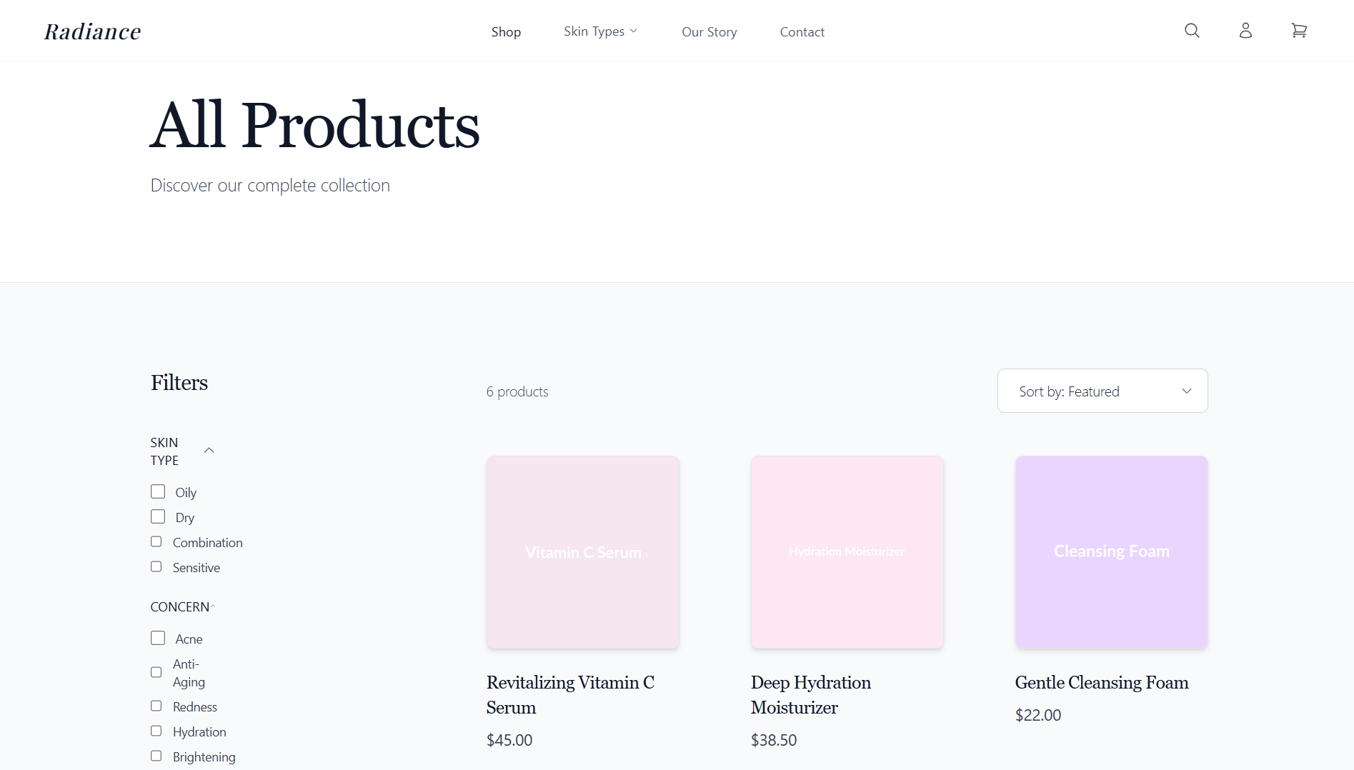 Radiance is a modern e-commerce product website specifically designed for a skincare brand. It provides a professional landing page that introduces the brand's story and core product offerings to potential customers.